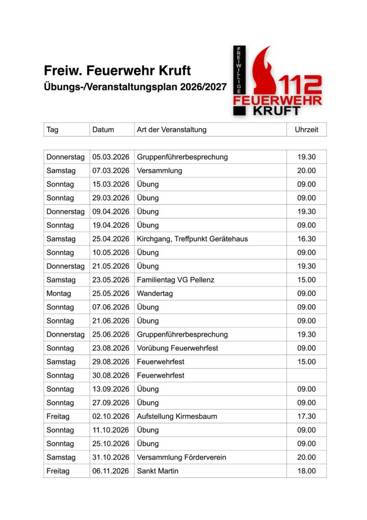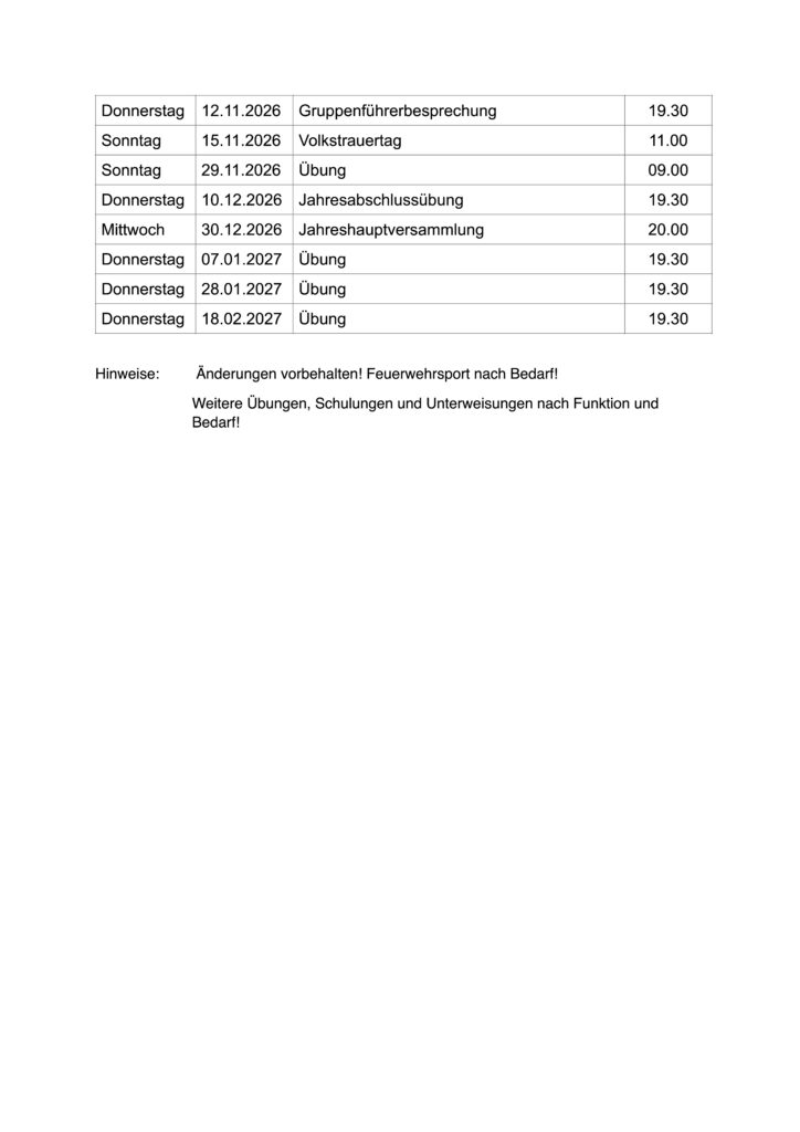 Ausbildungen auf VG-Ebene für Erste-Hilfe, Führungsstaffel, Brandschutzerziehung, Führungskräfte und Absturzsicherung sowie Gruppenübungen und Drehleitermachinistenausbildungen erfolgen nach gesondertem Plan.